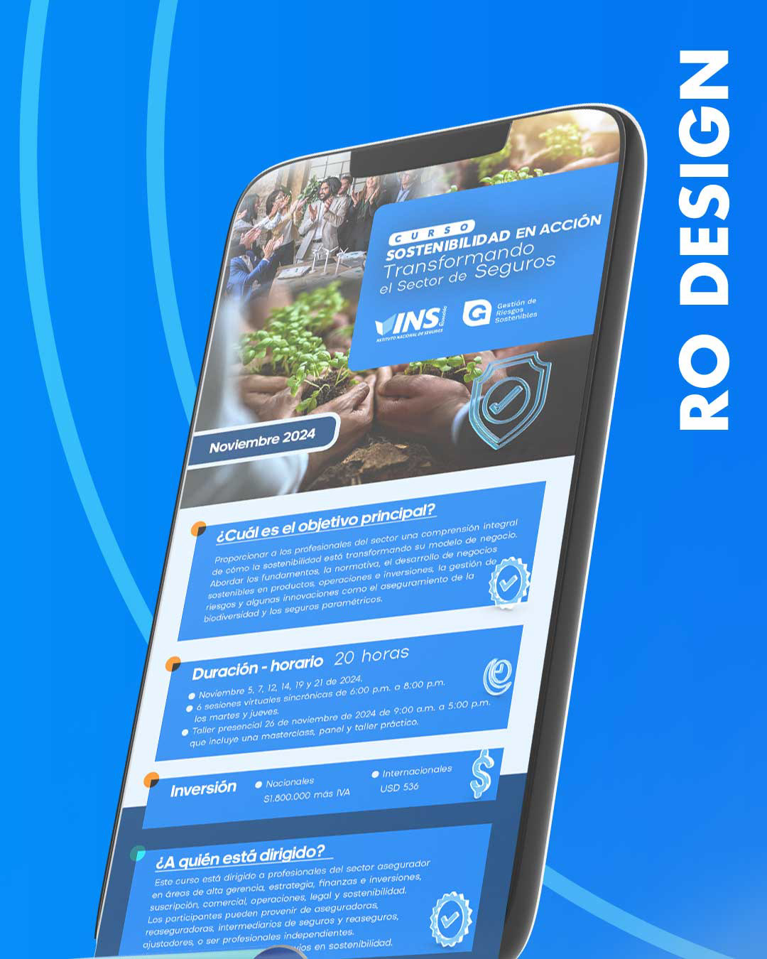 Portafolio Destacado: De la mano con el Líder del Gremio Asegurador (INS). Hace un tiempo, tuve el honor de apoyar al Instituto Nacional de Seguros (INS) con el diseño y el marketing para uno de sus programas más estratégicos: CURSO: SOSTENIBILIDAD EN ACCIÓN TRANSFORMANDO EL Sector de Seguros. Mi rol fue esencial para comunicar la relevancia de este curso de 20 horas dirigido a la Alta Dirección y líderes de Estrategia, Finanzas y Reaseguros, enfocado en herramientas para negocios sostenibles. Un dato importante: Como profesional del diseño, es un orgullo saber que mi trabajo formó parte de la historia de esta institución, la cual ha evolucionado recientemente. Porque todos crecemos y las grandes marcas se transforman: ¡El INS ha evolucionado! Ahora, lleva su legado educativo a nivel internacional bajo su nueva identidad: CISEG – Centro Internacional de Estudios en Seguros. Demostrando que un diseño efectivo tiene un impacto duradero, incluso cuando la marca da su siguiente gran paso.